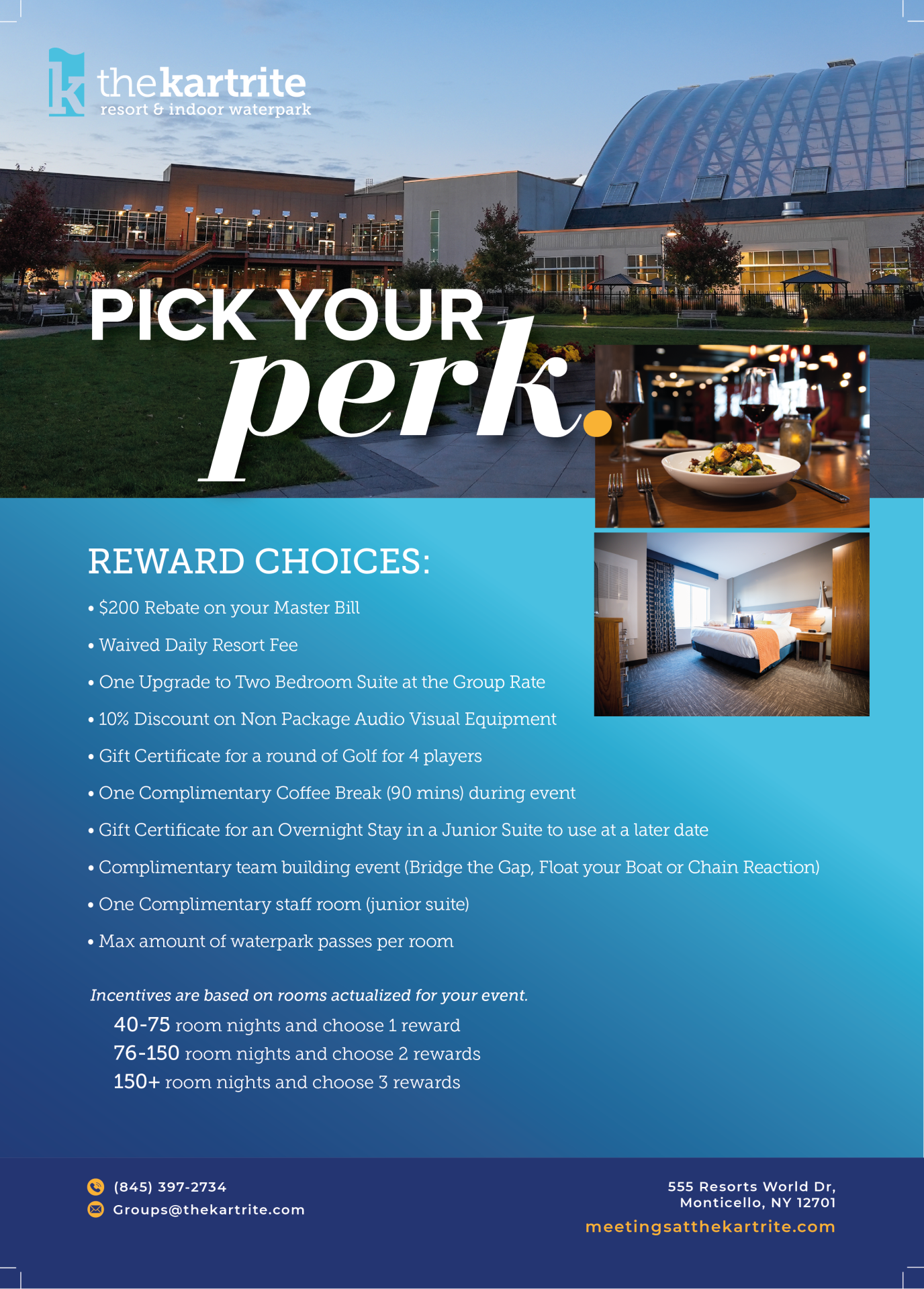 - Mid-week is the perfect time to bring a group or event to the Kartrite Resort, Catskills. So much so, that we are offering 15% commission for all mid-week (Sunday-Thursday) groups that take place now through December 30, 2026. Blackout dates apply for holidays.