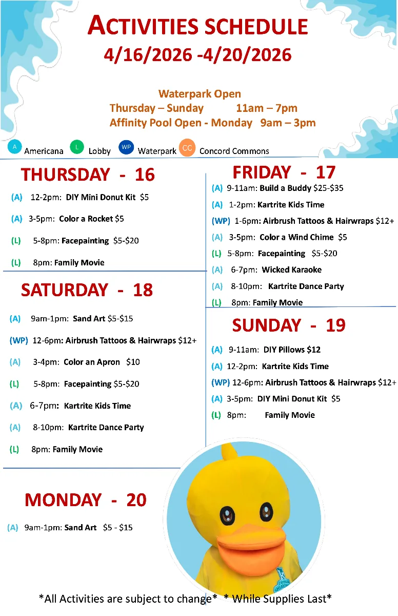 Our weekly activities schedule is updated now with special, spontaneous events and pop-up activities that won't make it to the main calendar. These spots fill quickly! Check the board or ask the front desk immediately to grab your spot! - Please note: All activities, locations, and times are subject to change without prior notice.